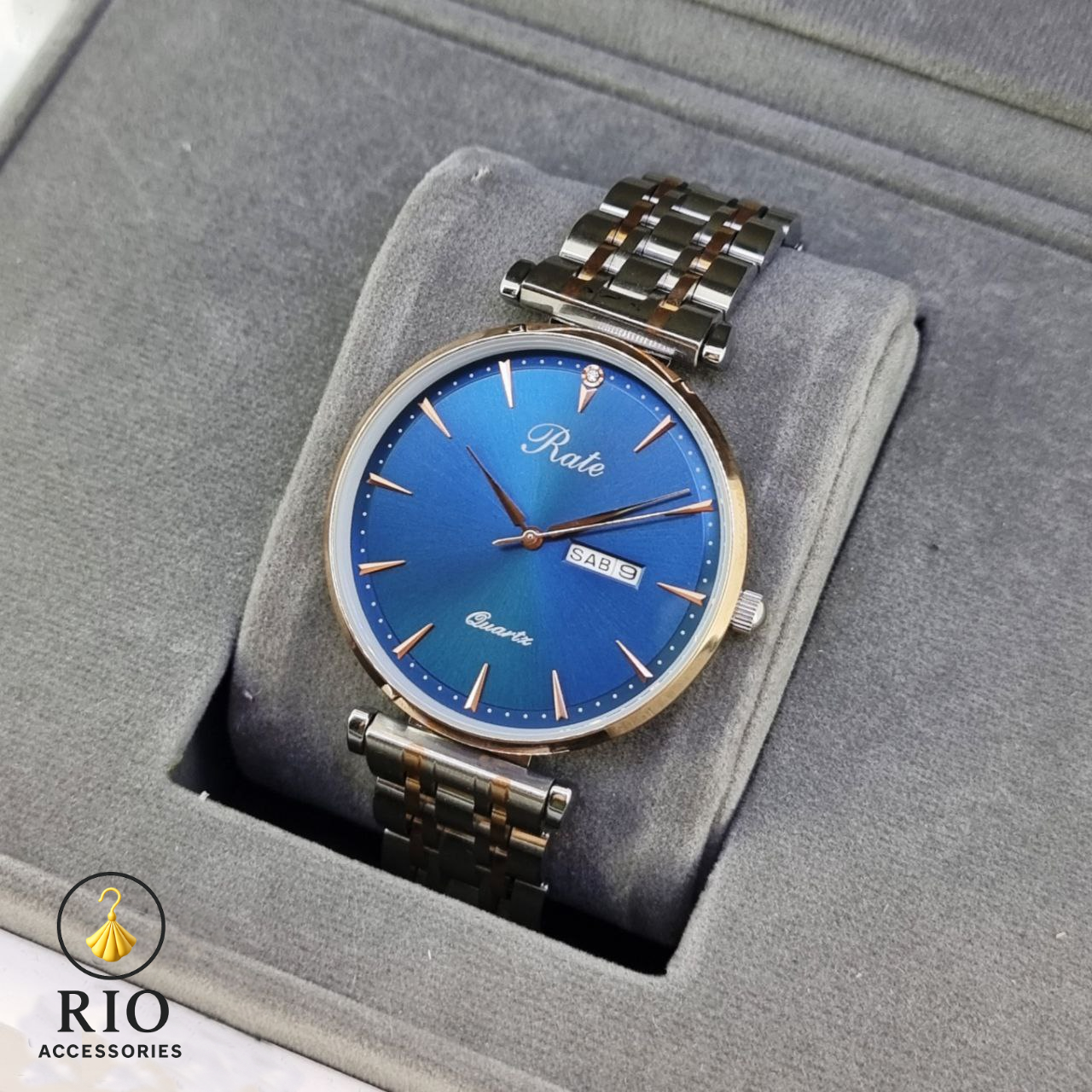 ساعت مچی مردانه Rate مدل Quartz در دو رنگ 1. بند فلزی مشکی و صفحه آبی 2.بند نقره ای طلایی صفحه آبی برند: Rateمدل: Quartz Day-Dateنوع موتور: کوارتز (Quartz)نمایشگر: آنالوگ با نمایش روز و تاریخ (Day-Date)جنس بند: استیل ضد زنگ با رنگ مشکی مات جنس قاب: فلز با پوشش ضد خش رنگ صفحه: آبی متالیک با جلوه لوکس ویژگی خاص: سنگ تزئینی در موقعیت ۱۲ برای جلوه خاص و متمایزمقاومت در برابر آب: مقاوم در برابر پاشش آب (مناسب برای استفاده روزمره، نه شنا یا دوش)قطر صفحه: حدود ۴۲ میلیمترنوع قفل بند: کلیپسی با قفل ایمنی مناسب برای: آقایان، استایل رسمی و نیمهرسمی.