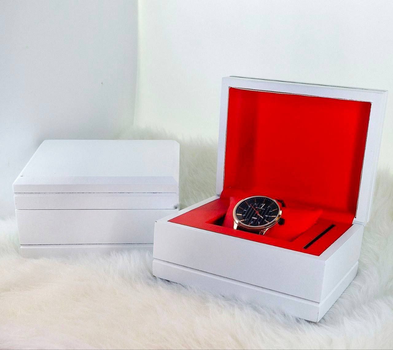 سفید مات: جعبه با رنگ سفید خالص و سطحی صاف، حس پاکی، مینیمالیسم و لوکس بودن را منتقل میکند.فرم مستطیلی کلاسیک: طراحی ساده و متقارن، مناسب برای نمایش حرفهای ساعتهای کلاسیک و مدرن.آستر داخلی مشکی یا قرمز : فضای داخلی با پارچه یا فوم مشکی یا قرمز ، تضاد زیبایی با رنگ ساعت ایجاد کرده و جلوه آن را برجستهتر میسازد.درِ لولایی محکم: باز و بسته شدن روان و مطمئن، مناسب برای نگهداری طولانیمدت یا هدیه دادن.کاربردها و مزایا:🎀 مناسب برای هدیه دادن: ظاهر شکیل و بستهبندی حرفهای، تجربه باز کردن جعبه را به لحظهای خاص تبدیل میکند.🧳 حفاظت از ساعت: آستر داخلی نرم و فرم جعبه، از ساعت در برابر ضربه، خط و خش و گرد و غبار محافظت میکند.📸 ایدهآل برای عکاسی تبلیغاتی: ترکیب رنگ سفید و مشکی، ساعت را در تصاویر برجسته میکند و حس لوکس بودن را افزایش میدهد.🛍️ هماهنگ با برندهای مدرن: این نوع جعبه با هویت برندهایی که بر سادگی، اعتماد و کیفیت تأکید دارند، کاملاً همخوان است.