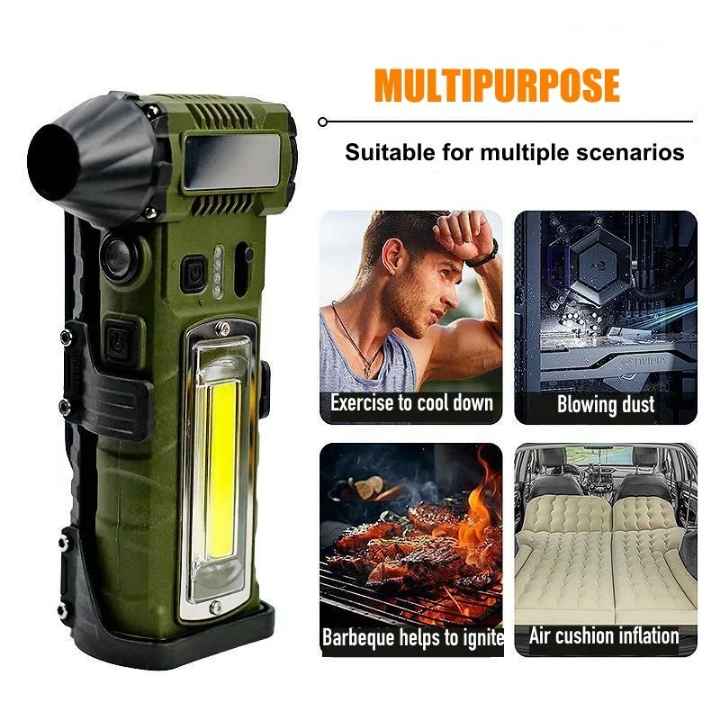 ویژگیهای برجسته:قدرت باد فوقالعاده: با موتور قدرتمند و طراحی خاص، این فن دستی جریان هوای بسیار قوی تولید میکند که برای خنککردن سریع در فضای باز یا محیطهای کاری بسیار مناسب است.نورپردازی چندمنظوره: پنل نوری تعبیهشده در دستگاه، امکان استفاده بهعنوان چراغ قوه، نور اضطراری یا روشنایی محیط را فراهم میکند.نازلهای قابل تعویض:نازل دهانه تخت (Flat Mouth)نازل بلند (Long Type)نازل کوتاه (Short Type)نازل مخصوص لباس (Clothes Nozzle) – مناسب برای خشککردن سریع لباسها یا استفاده در سفرطراحی مقاوم و قابلحمل: بدنه مستحکم با گیره نصب، مناسب برای استفاده در کمپینگ، کارگاه، خودرو، یا فعالیتهای فضای بازکنترل آسان: دکمههای کنترلی روی دستگاه امکان تنظیم حالت باد و نور را فراهم میکنند.کاربردها:کمپینگ و سفرهای طبیعتگردی استفاده در خودرو یا محیطهای کاری گرم خشککردن لباس یا تجهیزات روشنایی اضطراری در قطعی برق یا شبهنگام.