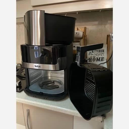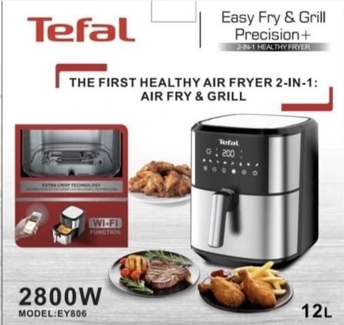 ویژگیهای کلیدی نوع دستگاه: سرخکن بدون روغن و گریل برقی ۲ در ۱مدل: EY806ظرفیت: ۱۲ لیتر – مناسب برای خانوادههای پرجمعیت یا مهمانیهاتوان مصرفی: ۲۸۰۰ وات – قدرت بالا برای پخت سریع و یکنواخت تکنولوژی Extra Crisp: برای سرخ کردن با حداقل روغن و نتیجهای برشته و طلایی گریل آلومینیومی دایکست: برای پخت گوشت و سبزیجات با خطوط گریل واقعی برنامههای خودکار: ۸ برنامه پخت شامل سیبزمینی، گوشت، ماهی، پیتزا، کیک، گریل، خشککن و گرمکردن مجددقابلیت خشککردن مواد غذایی: مناسب برای تهیه اسنکهای خانگی مثل چیپس میوه کنترل دیجیتال لمسی: با نمایشگر LED و تنظیم دما و زمان اتصال Wi-Fi: برای کنترل از طریق اپلیکیشن Tefal و دسترسی به دستور پختهای متنوع قابلیت شستوشو در ماشین ظرفشویی: قطعات جداشدنی مثل سبد و گریل ابعاد تقریبی: 40 × 38 × 35 سانتیمتر امکانات: هوشمنداپلیکیشن اختصاصی Tefal: شامل صدها دستور پخت، امکان تنظیم زمان و دما از راه دور، و دریافت نوتیفیکیشن پایان پخت پیشنهادهای پخت هوشمند: بر اساس نوع ماده غذایی و وزن آن.